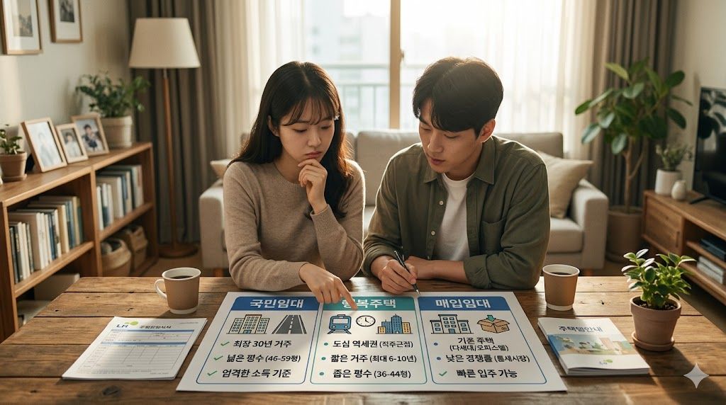 저 역시 처음엔 무작정 공고가 뜨는 대로 다 지원해 볼까 생각했지만, 각 임대주택마다 타깃층과 주거 환경이 완전히 다르다는 걸 깨달았습니다. 오늘은 예비신혼부부와 청년 입장에서 이 세 가지 임대주택 유형의 특징을 완벽하게 비교하고, 우리 커플에게 가장 유리한 선택지를 찾는 방법을 정리해 보겠습니다.