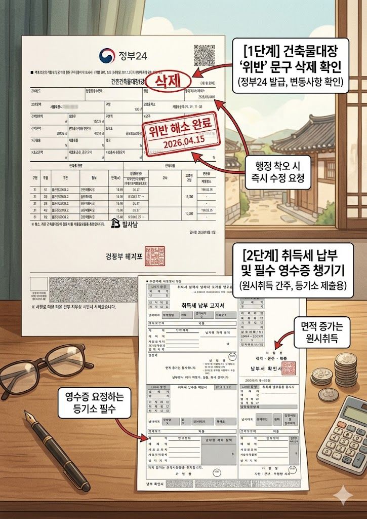- 늘어난 면적에 대한 취득세를 납부해야 하며, 이 영수증이 있어야 등기부등본 수정이 가능하다.
